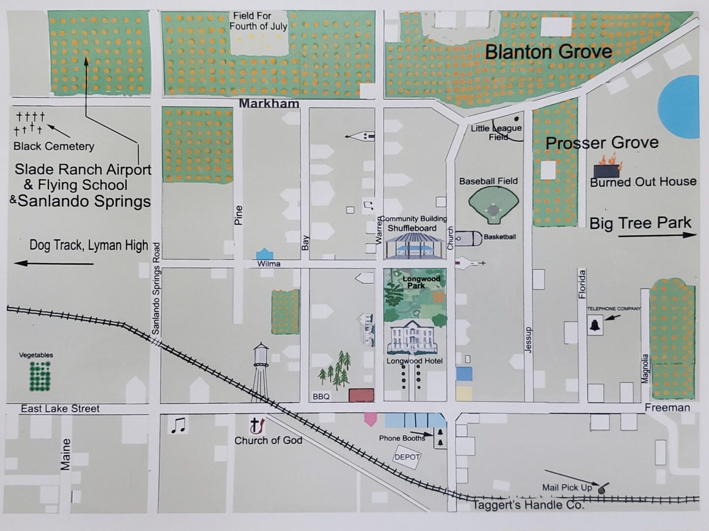 - Black Community: There were very few black families here. Mrs. Ziegler’s family lived down where Winn-Dixie is today. Elijah Sigler drove a tractor every day into town with a cart. There was also Stella (Fleece) and her family, and Coral Marie who lived in a shack where the current McDonald’s is.